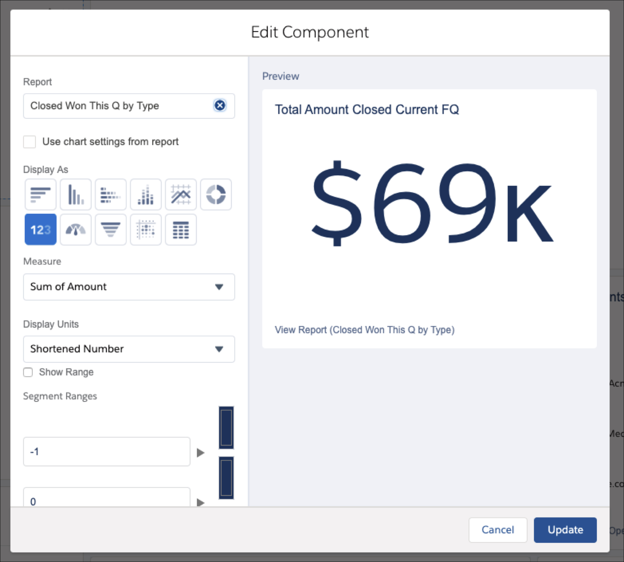Salesforce: 当用户构建仪表板组件时,他们在添加和更改参数和设置时会看到一个正在进行的预览 (右)(左)。